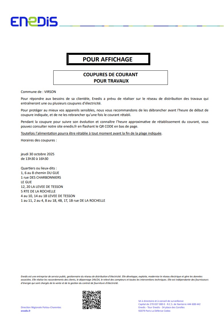 Actualités de Virson Coupures de courant pour travaux – Jeudi 30 Oct Fermeture de la mairie LUDOTHEQUE FMR Planning camion santé en mouvement Permanence ADIL à Surgères Jeudi 23 Octobre Collectes de sang – La Jarrie (3 nov) / Aigrefeuille (10 Nov) Entretien du réseau électrique Ateliers couture CIAS Point conseil budget UDAF 17 Accueils Petite Enfance, Enfance et Jeunesse sur le territoire Pass Cyclad Voir toutes les actualités