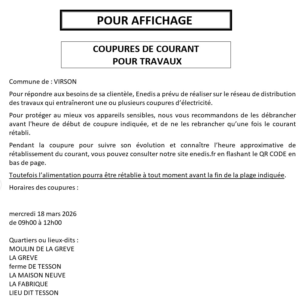 Actualités de Virson Coupures de courant pour travaux Taille des pommiers POPOTE ET PAPOTE Jeudi de l’emploi CDG17 – Jeudi 19 mars 2026 – Surgères Don de Sang Convocation conseil municipal du 23 février 2026 Santé En Mouvement ALERTE MÉTÉO – VIGILANCE ORANGE VENTS VIOLENTS Conciliateur de justice 25ème vide-greniers « Ludothèque FMR » Voir toutes les actualités