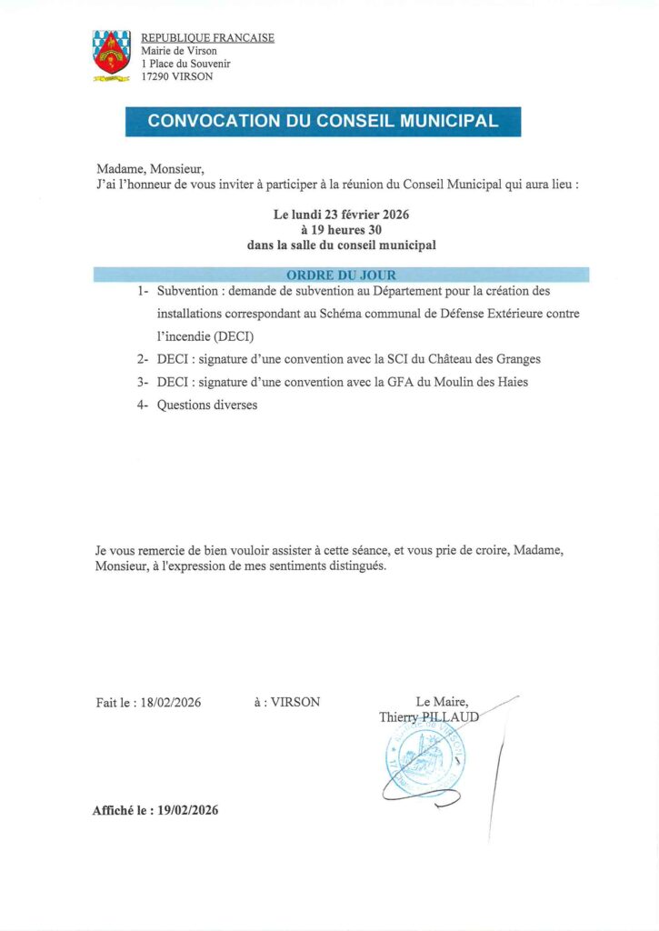 Convocation conseil municipal du 23 février 2026Par Aurélie BOULAN / 19 février 2026 Facebook Twitter LinkedIn Email Imprimer