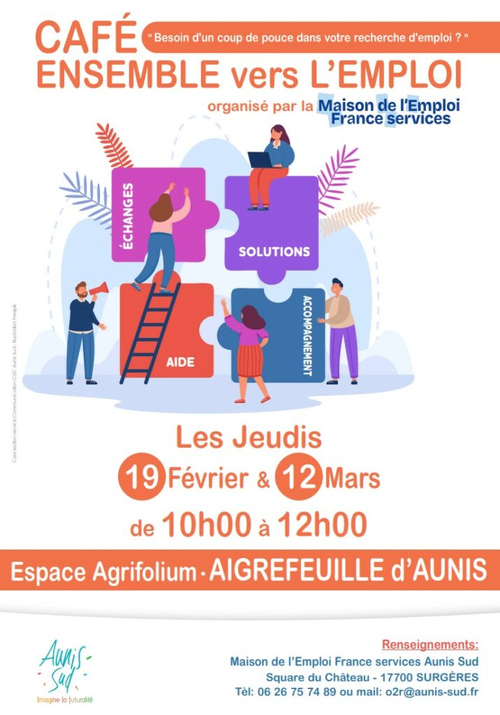 Les Cafés « Ensemble vers l’emploi » ont lieu à AIGREFEUILLE-D’AUNIS de 10h00 à 12h00 à l’Espace Agrifolium (salle 3).